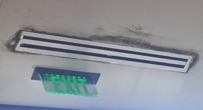 Before we get into the speculation part, though, let’s lay out the facts of the case. First, those are supply diffusers for the air conditioning system. They’re in a bulkhead over the windows on an exterior wall. The dark areas around the diffusers have been growing over the past few years. It’s hard to tell what those dark areas are, but it’s probably either dirt or some kind of microbial infestation (e.g.,mold).