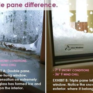 在泄漏的双窗帘窗口上看到冰也不少见。下面的照片显示一个Intual窗口(三重窗格)旁边的双窗格/双悬挂窗口,在-7f下雪的日子上,在零风寒下的-36f。