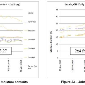 可以增加护套含水率的其他因素是墙体组件中的漏气和室内湿度水平升高。在某些情况下,甚至扩散也会产生影响——也就是说,内部水蒸气通过干墙和绝缘材料扩散。这就是为什么Kohta Ueno推测Lois Arena墙上的0.5烫发防蒸汽涂料可能是她的低读数的部分原因。