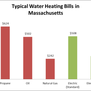 在右边的图比较了一个典型的一个新的2000平方英尺的马萨诸塞州的家每年热量的燃料成本。类似的曲线图进行比较的成本来操作不同类型的热水器在下面示出。不同的燃料选择的相对成本将是相似的气候相似,但它是要注意重要的是,天然气是不是在很多地方使用。