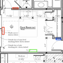 现有的通风口:红色供应通风口在浴室下墙,红色供应通风口在卧室的卧室和蓝返回通风口的卧室。