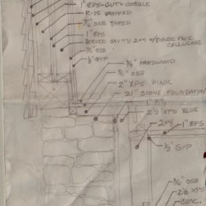 外墙框架内部的7/16”OSB胶粘层作为连续的主要空气屏障,同时加强旧的松散钉T和g1“x 6”外部护套的吱吱作响的房屋墙壁。在7/16”OSB空气屏障/墙框架加强筋顶部的1“EPS层是作为一个热断裂,直到我得到外部泡沫安装在未来。我使用eps在所有硬质泡沫内部,因为它的蒸汽透气性。服务腔上最内部的3/4”OSB层是石膏内部,只是在墙内的结构支持,以容纳沉重的墙壁艺术。内部的2 X 4服务腔墙允许所有服务,以及深展开的窗框,以及给我一个平面在一个非常波浪形和垂直的现有外墙。