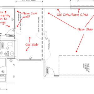 墙壁目前是裸露的CMU和开放的托梁上面有甲板。计划pex在平板,为未来的挂钩。