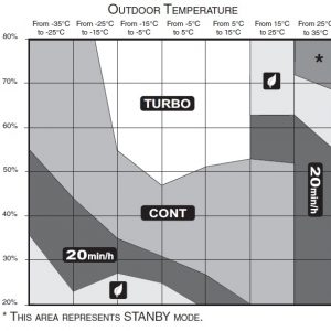 如果这是唯一的限制,那还不错。我仍然在想办法弥补在这些时间里大约30%的新鲜空气的损失。这是G2400控制方案的图表。如你所见,有相当大的区域有1/3或更低的通风率(小叶子符号是生态模式,即每小时50分钟用于除霜)。