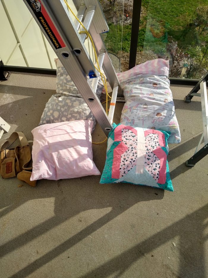 我昨天搭建并使用了这个平台。我5岁的女儿看到了,马上问我是不是要跳下去;它确实有点像跳水板。然后她担心我会掉下去,所以她在梯子周围放了“安全枕头”。