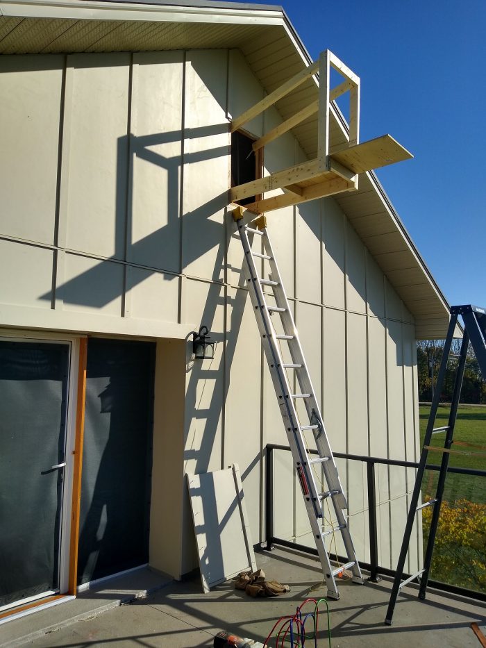下面的墙上有个阁楼的舱口,所以我想我可以用它装一个平台。另一端的支撑可以直接往下12英尺到下面的阳台,或者用对角线支撑支撑在墙上。后者似乎是一个更健全的结构,但它意味着永久性地破坏哈迪的墙板。我可以在一定程度上修复损坏,但如果我想再次使用该平台,损坏和修复将重复进行。对于前一种选择,我可以使用超长的支撑延伸到平台之上,形成垂直的连接栏杆,使栏杆更加简单和坚固。