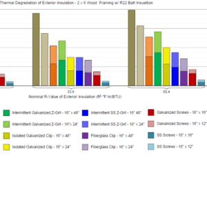 我学习热力学已经有很长时间了,所以这超出了我对这一点的智能响应能力——在16"/ 24" OC框架的中点,通过墙壁的热传递如何受到8"/12"之外的更大的导热紧固件的影响?对于中心的热量迁移到紧固件的区域,它仍然要穿过隔热层,隔热层是统一应用的,所以我不确定热量是否会流向紧固件,而不是从热到冷,并向外移动。如果对紧固件没有漏斗效应,那么唯一应该发生的热量损失是在那一小部分墙体中,其余墙体的性能应该是畅通的。