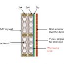 基本上,从内部到外部:5/8″干墙> 2×4框架与岩棉> 2×4框架与岩棉(尚未决定是否墙壁将共享顶部/底部板)> ZIP护套> 1″砖排水>砖立面的最小气隙。我附上了一个快速的插图作为参考(视图是从上往下看的)。