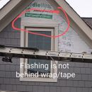 今天这里的工作人员正在移除窗户和其他闪光区域上方的木板....没有一个是用胶带粘在房屋包装上的。还让他们去掉角落的装饰和包裹不是连续的角落。不仅如此,在圈出的部分根本没有包装。