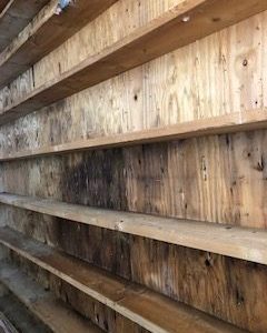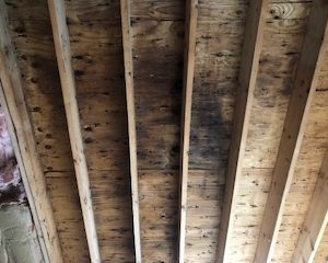 That’s mold. That means you’ve had moisture problems in that roof assembly, which is not surprising given the way it was originally built. That mold doesn’t look too bad though. I would clean it with a mold killing cleaner (which can be as similar as vinegar, or use a commercial product). I would then paint over it with a mold killing primer to keep it from coming back. Once you’ve done that, insulate and air seal as we’ve described here and you should be in good shape going forward.