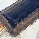 这是在柏油几年前所见的照片。我认为把一些“通过屋顶”周围的框架,并在玻璃上和焦油沿着边缘:但是,“通过屋顶”是不好的水坑位置/淹没,这是在天窗的底部边缘的现实/玻璃面板1/2“深熔池可在该位置一个时间持续数天。