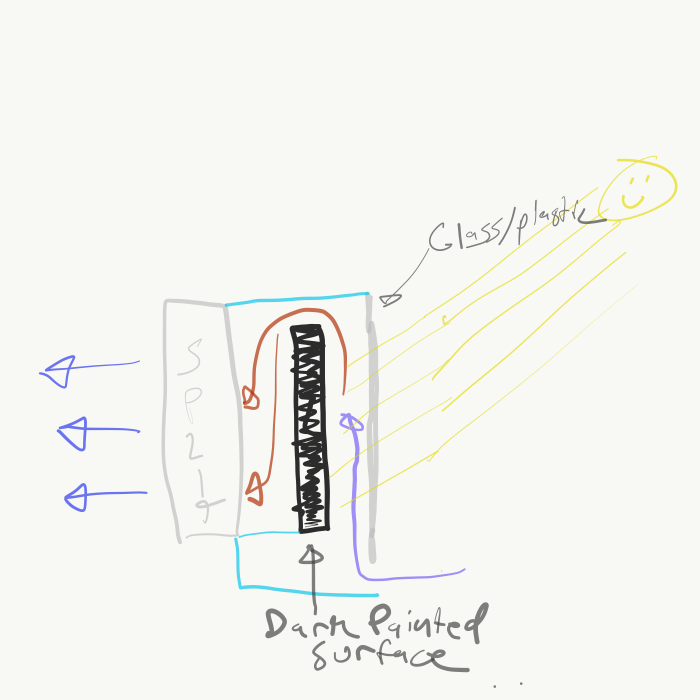 如果你想要实验提高能源效率:把所有的东西放在阳光下,让分裂的空气通过一个不透明的表面,和一个黑色的表面。太阳加热了黑色的表面,不透明的薄膜包裹着它,加热了空气。