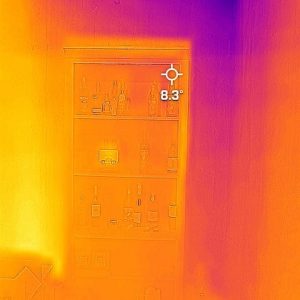 更多照片。北墙的IR图像。左侧是内部,墙壁向右向东的外部。还显示房间中的二氧化碳水平。截至今天早上,二氧化碳约为3400 ppm。回填主要是沙/淤泥/粘土,因此不应该有任何有机物,因此二氧化碳可能来自霉菌的生长?