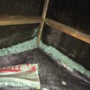 霉菌似乎在CCSF与屋顶甲板直接接触的点停止。覆盖层已经发霉,一直延伸到山谷的顶部,一直延伸到车库的屋顶甲板上(这是一个加州风格的山谷),一直延伸到车库的房间,并在车库覆盖层的底部向后延伸。乍一看,你几乎会以为是失火了,全是煤烟。有一个半死不活的舱口,用一把锋利的刀穿过泡沫进入热屋顶的阁楼,啮齿动物已经在里面咬了几条小通道,但除此之外,它还能钻进洞里。这似乎是水分从房子中渗出的地方,但我倾向于认为它的渗漏程度不足以证明霉菌的数量。阁楼的领结大部分之间都有玻璃纤维绝缘,牛皮纸朝上,这让我相信它们是事后才安装的。我不明白他们为什么会在那里,因为屋顶椽一直到山顶都是隔热的。
