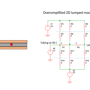 For DCContrarian, here's a super approximate 2D lumped model for 1 sq foot of floor, with a tube on the left edge of the region modeled and the right edge of the region modeled halfway between two tubes. The values are thermal resistances, not R-values. The vertical ones each represent 1/3 of a square foot, so there thermal resistance is 3X the R-value.
