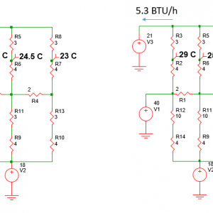 So to restate what I think you've said above, changing the basement temp would increase flow through R1, R4 and drop avg temp on those labeled nodes and hence affect overall output to the V3 sink but if increasing insulation that basement temp has less and less of an impact on overall flow through R1, R4 and would make those temps more uniform
