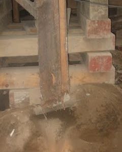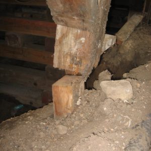 我也鼓励你在做决定之前做进一步的调查。我们也住在西北太平洋沿岸,住在一座106年的老房子里,那是柱子和码头的建筑,建在一个有木墙的爬行空间上,就像你描述的那样。搁栅之间有玻璃纤维隔热层(老鼠也出没),爬行空间的墙壁上有薄薄的泡沫护套。柱子的形状非常糟糕,有些已经严重腐烂,以至于房子的一个角落只能由内部的柱子支撑(基本上是角上的悬臂)。直到我们拆除了墙壁的绝缘材料,才看出损坏的程度。其他的帖子修理得很差(见附图)。所需要的工作可能不仅仅是绝缘和密封。如果你打算在这个房子里住上一段足够长的时间,那么就像Martin建议的那样,在结构上、地震上和舒适/能源方面,增加混凝土墙可能会更有意义。