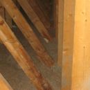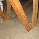 我试着附上几张照片,展示了阁楼上的石板墙的布局,石板墙后面的桁架染色/分裂,以及石板墙被拆除后桁架分裂的更好的照片。