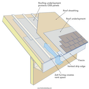 答:我不确定你的意思是“垂直垫片”,但它肯定是一个好主意,包括在你的啜饮和屋顶之间包括通风渠道 - 特别是如果你已经有凝结和腐烂的问题。下面再现的图像显示了建议的细节。