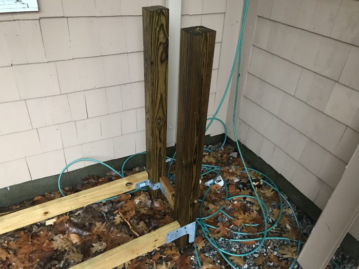 房子的前面是你可以走出地下室的地方。在第一楼上,在门廊周围的包裹。最初,当雨水以及熔化的雪一起越过散热器后面的雨水(仅由金属板组成)浸泡在地下室内的鞘后面,我的散热器散落着散装水分。由于我已经重新映成了大部分门廊,这已经解决了。