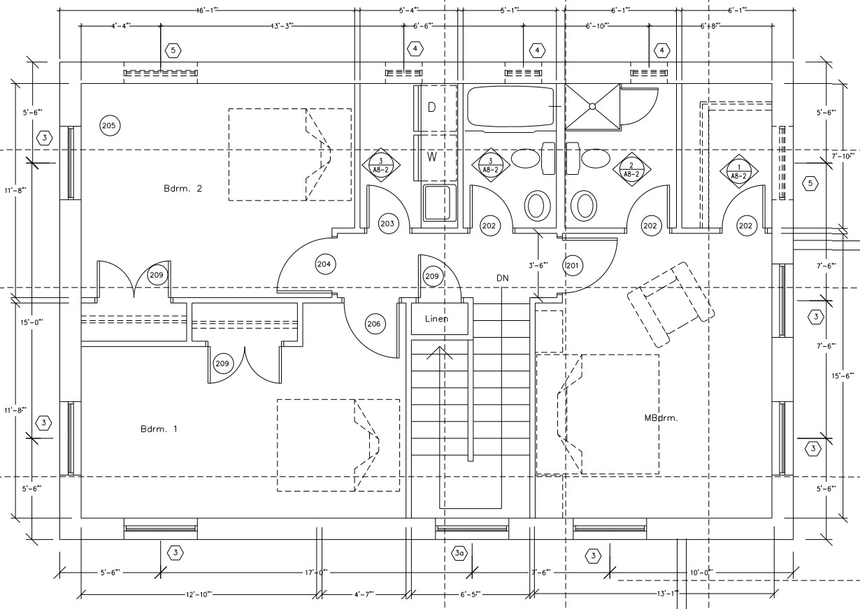 2.您的尺寸是任何框架和分包商的噩梦,它可能导致太多的错误。你的第一个维度线应该在外墙到下一个开口的中间到房间墙壁的一侧之间,从那里到下一个开口的中间到下一个房间墙壁的一侧,以此类推到外墙,所有这些都是连续的。第二维度线在同一房间墙壁之间。第三条尺寸线应该是从外墙到外墙。我建议不要标注壁厚的尺寸,因为它们会导致分数,因此更难阅读。