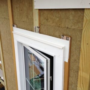 Next we install the mineral wool and furring strips. We flush the furring strips to the plane of the window flange using a speed square and level. At this point we install the trim, then the siding. While we're installing the trim we flash the head of the window / trim again --- per the window mfg. and trim mfg. instructions.