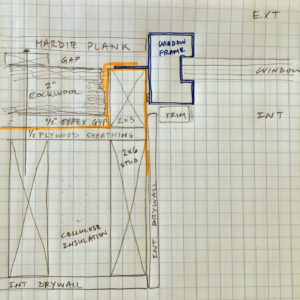 3. The orange highlight represents the air barrier. I'm leaning toward a fluid applied or maybe Tyvek and tape. I don't know that I have to come all the way in. If I lap the tape over the nail fin to the side of the 2x3 spacer it would probably be fine.