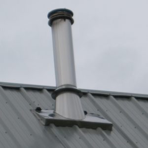 我nstalling wood stove chimney to go through cathedral ceiling with 12/12 pitch. This is new construction. Roofing material will be galvalume R panel. On the roof, what is the recommended layering system to prevent moisture from entering at the chimney penetration? I have seen metal roof with the flexible high temp boots on top sealed with silicone, and I have seen 12/12 metal roof flashing adhered by sealant directly to the roof sheathing with the roof panels cut around the flashing and sealed , and a combination of many other ways. What is the best practice for new construction for flashing a 6″ wood stove chimney on a 12/12 pitch with galvalume R panel?