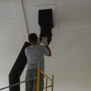 The original plan was to terminate the top of the radiation shield with a Dektite silicone boot. Unfortunately, on a 12/12 roof, the circle of a round flue pipe turns into an oval, and that doesn't scribe to a stepped rubber boot. We had to use the R panel roofing and caulk to terminate the top.